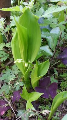 実は、これは、3~4年くらい前にお花屋さんで買ったすずらんの切花(といっても、株分けみたいになっているもの)をいつまでも飾っていたら根っこが出て、地植えにしたら根付いて、毎年地味に増え続けているものなのです。